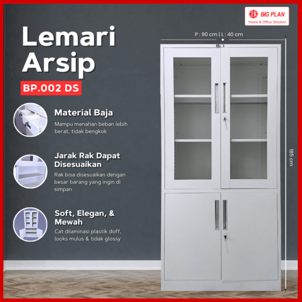 Perkenalkan Lemari Arsip BP.003 DS dari Big Plan! Ini adalah solusi penyimpanan sempurna untuk kebutuhan dokumen Anda. Dengan tampilan elegan warna putih doff, lemari ini sangat cocok menghiasi ruang kerja atau rumah Anda. Selain itu, kami menggunakan baja berkualitas tinggi, sehingga lemari ini memiliki daya tahan luar biasa dan stabilitas yang Anda butuhkan.