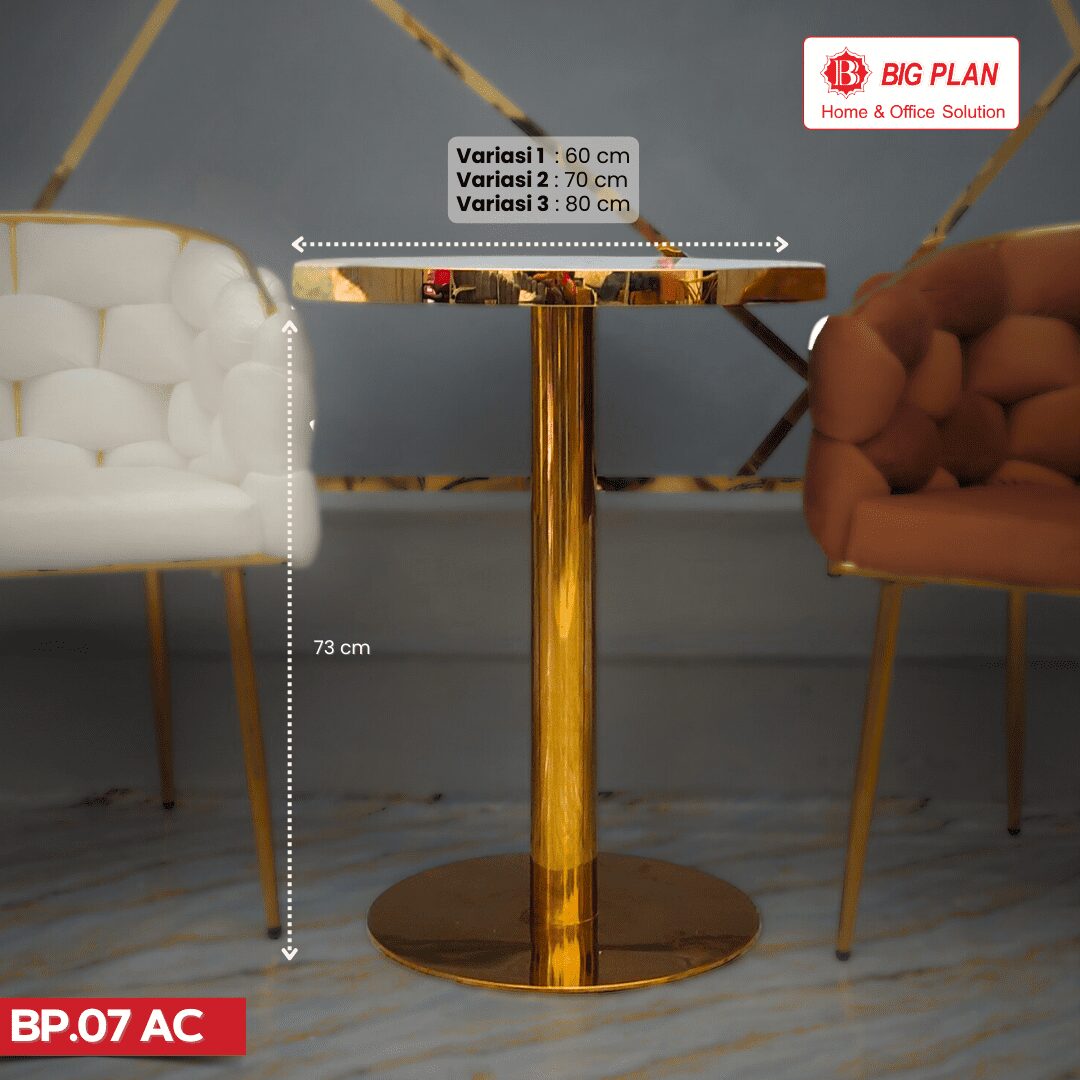 - Desain Unik dan Modern: Tampilan meja BP.07 AC dengan permukaan marmer dan kaki stainless steel dengan desain yang unik memberikan kesan yang tak terlupakan.